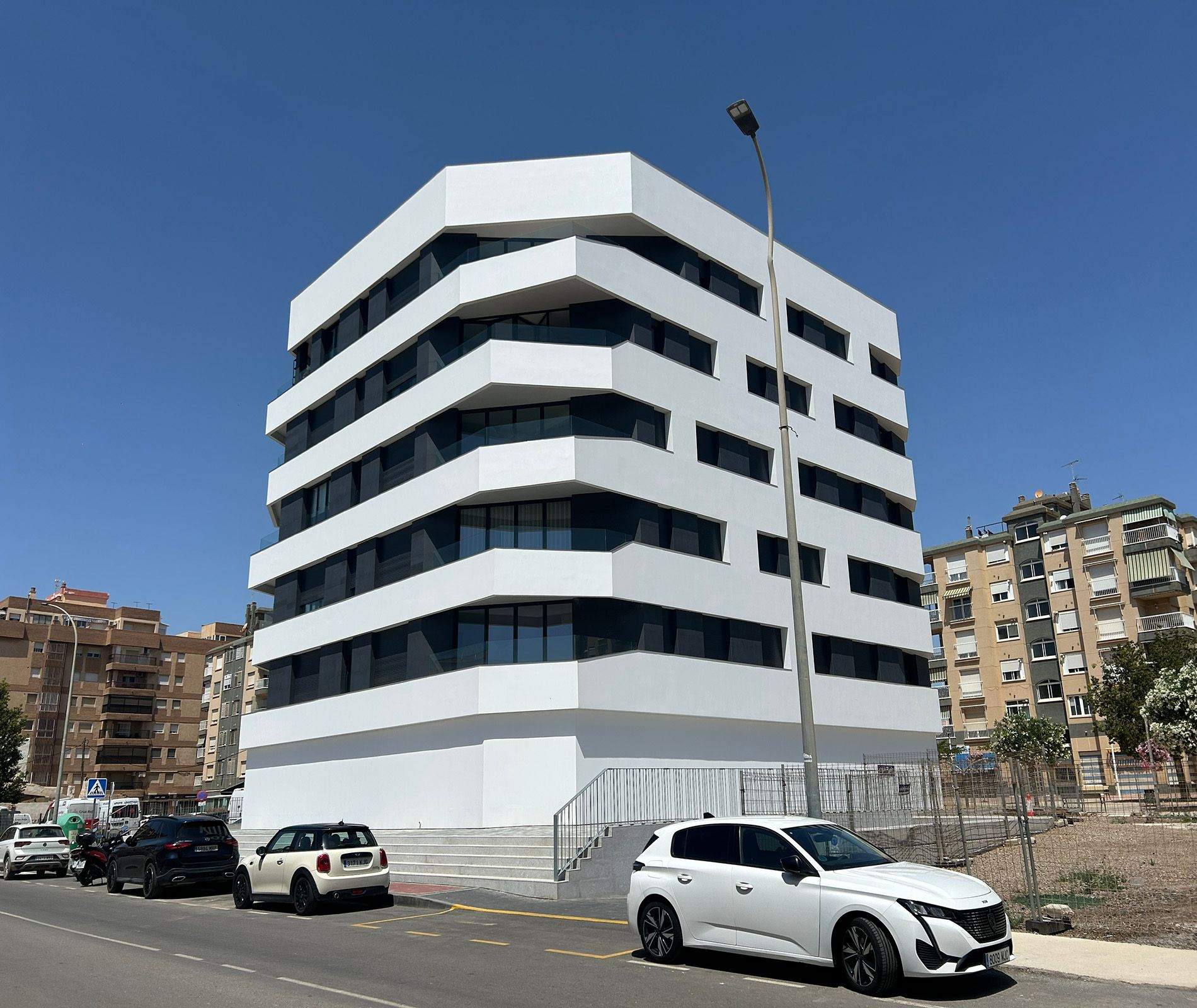 Se proyectó construir un edificio de referencia, no solo en el Residencial Las Yucas, sino en toda la bahía de poniente. Partiendo de un prisma cubico, los arquitectos, articulan un volumen complejo trabajando las aristas, y danto total protagonismo a la impresionantes vistas al mar existente. El resultado es un edificio con aspecto actual, y recuerdos al minimalismo. Se trata de un bloque colectivo de 15 viviendas, a razón de 3 viviendas por planta, donde además se incorpora en planta baja, el uso comercial, y en planta sótano, el uso garaje. El interior de las viviendas, es impresionante, la memoria de calidades incopora materiales como los SUELOS PORCELÁNICOS de la marca PORCELANOSA, AZULEJOS DE GRAN FORMATO, PUERTAS BLANCAS, PINTURA LISA, etc. Manteniendo las ya de por si buenas calidades con las que se venían construyendo en este residencial, PUERTA ACORAZADA, INSTALACIÓN DE CLIMATIZACIÓN, etc.