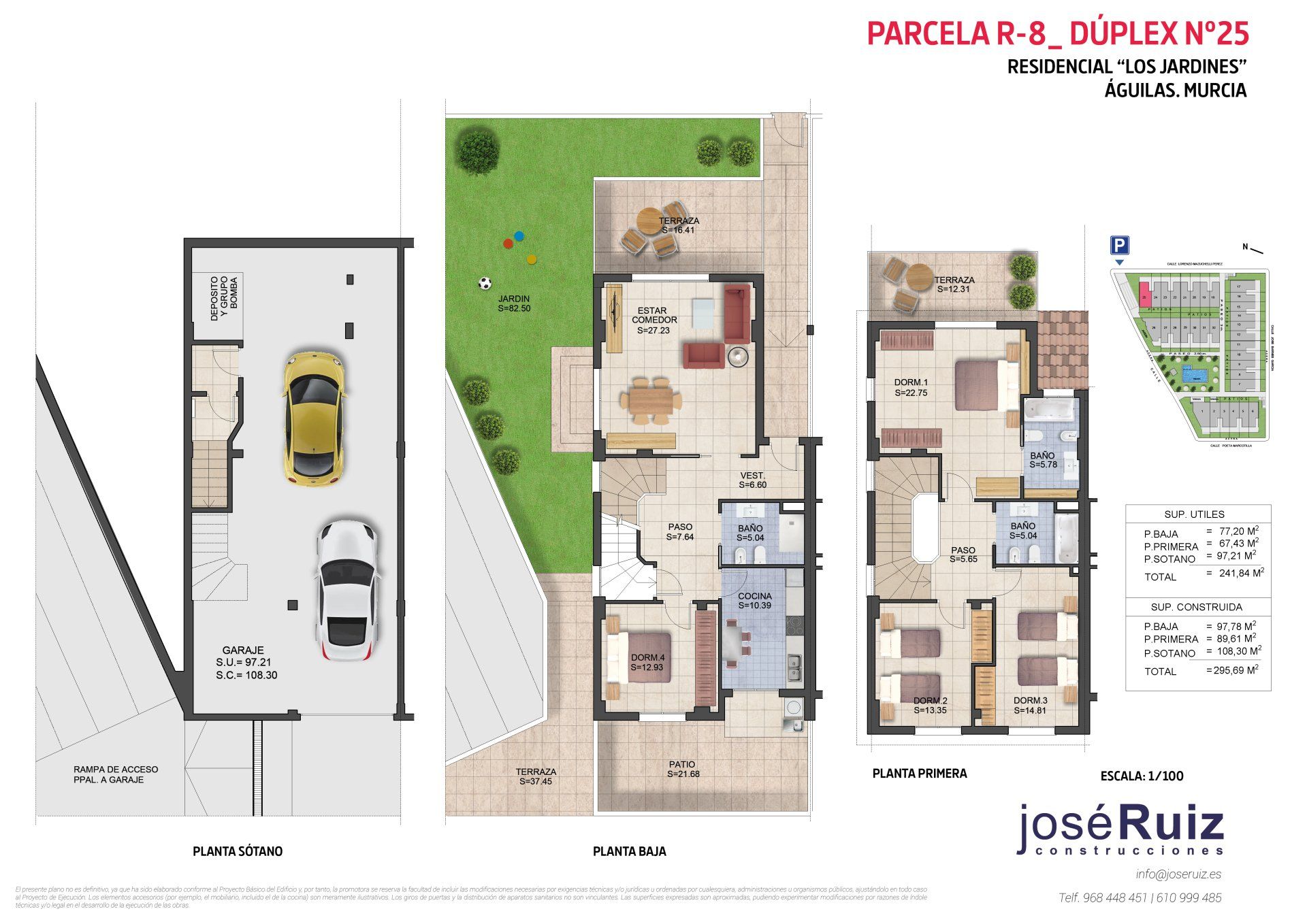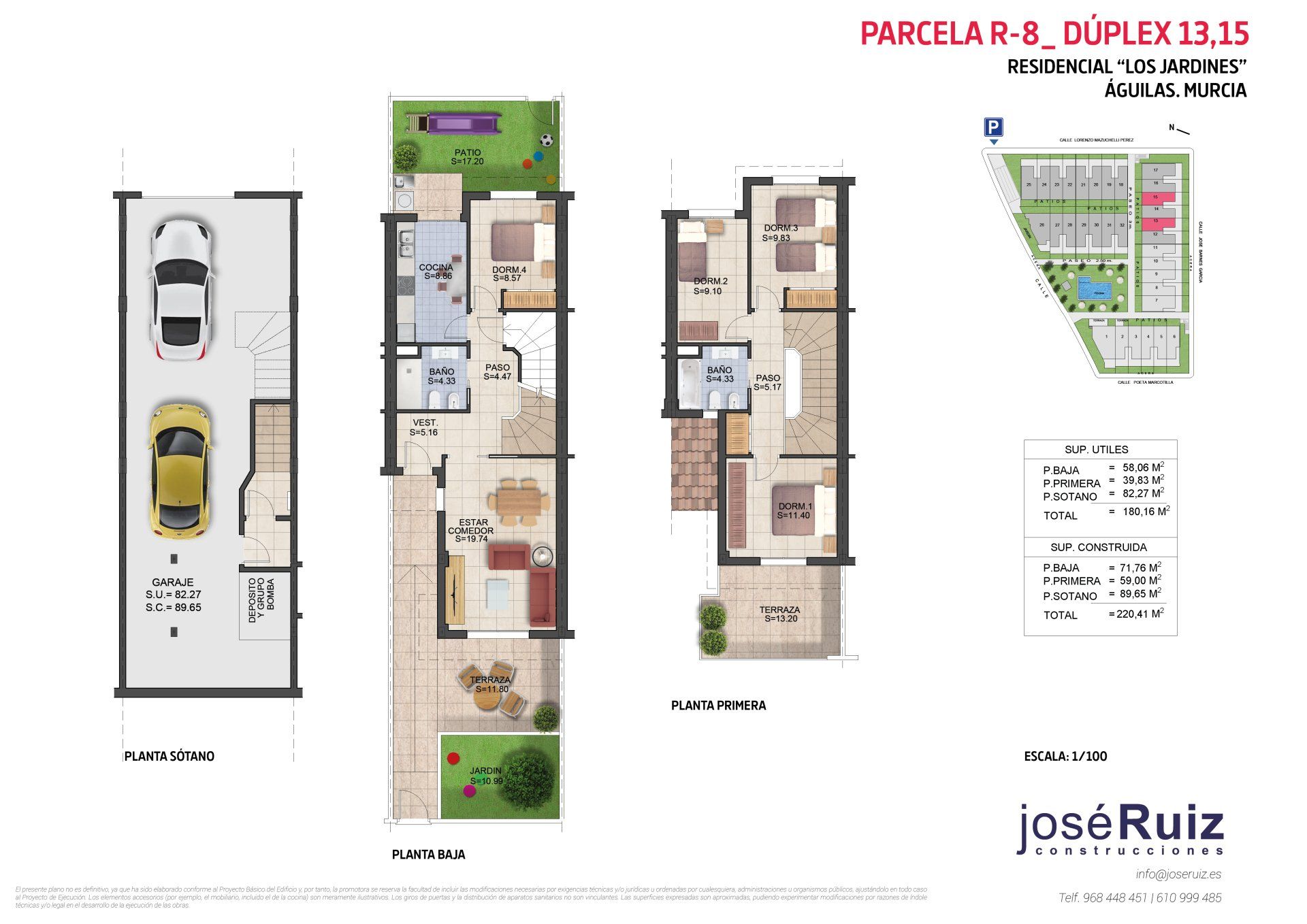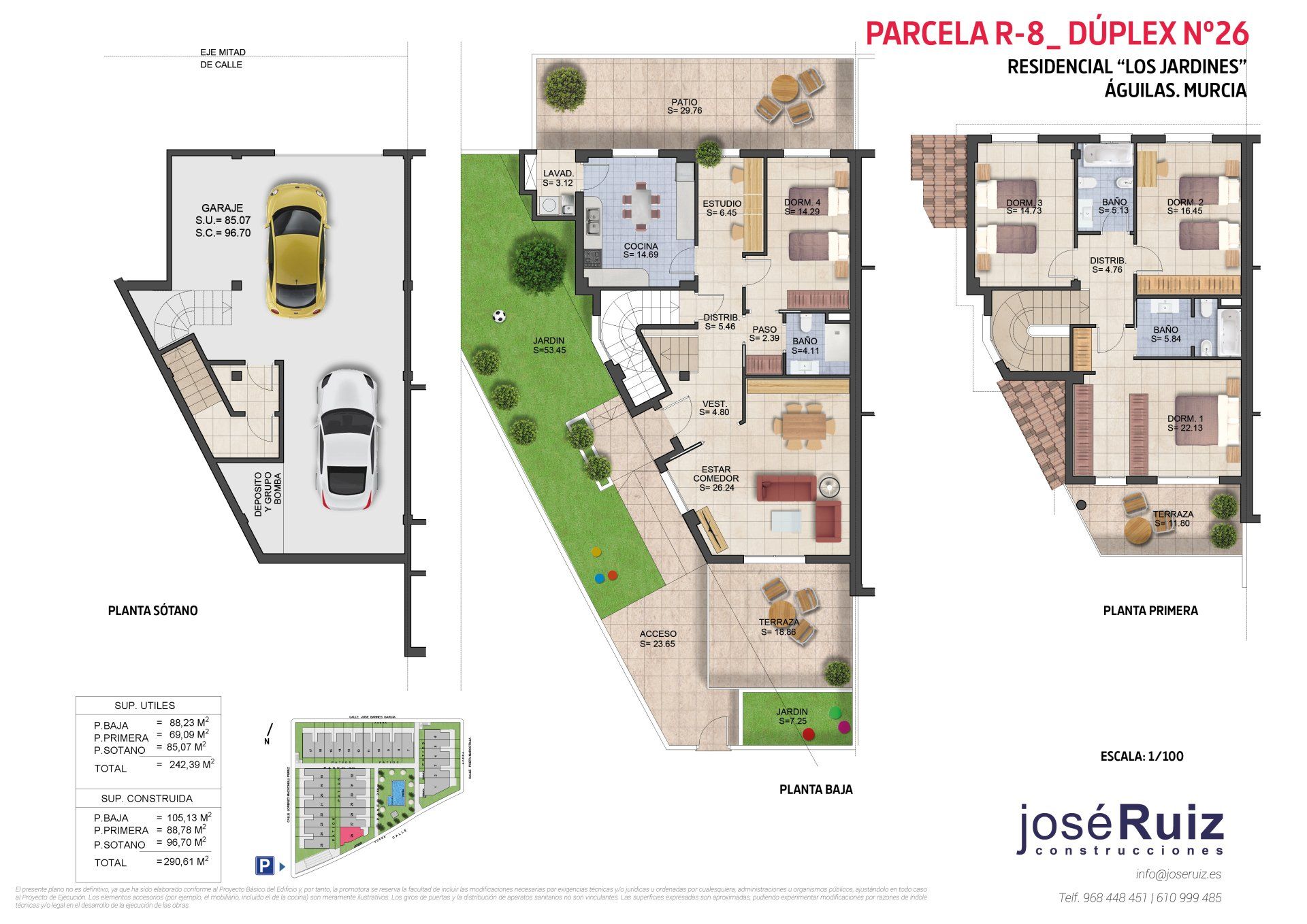 Se ha proyectado construir DÚPLEX DE 4 DORMITORIOS CON GARAJE INDIVIDUAL para al menos 2 vehículos. En lo referente a la estética exterior, se ha optado por dar CONTINUIDAD A LA LÍNEA ESTÉTICA EXTERIOR DE LOS DÚPLEX (más de 200) ya construidos en la urbanización, con pequeños matices para adaptarlos a los tiempos actuales. El cambio más importante se producirá en el interior, el INTERIOR DEL DÚPLEX SE HA ACTUALIZADO POR COMPLETO EN CUANTO A ACABADOS, en esta nueva promoción se incorporan los SUELOS PORCELÁNICOS, AZULEJOS DE GRAN FORMATO, PUERTAS BLANCAS, PINTURA LISA, etc. Manteniendo las ya de por si buenas calidades con las que se venían construyendo los dúplex en esta urbanización, PUERTA ACORAZADA, PREINSTALACIÓN DE CLIMATIZACIÓN, ARMARIOS EMPOTRADOS, etc.